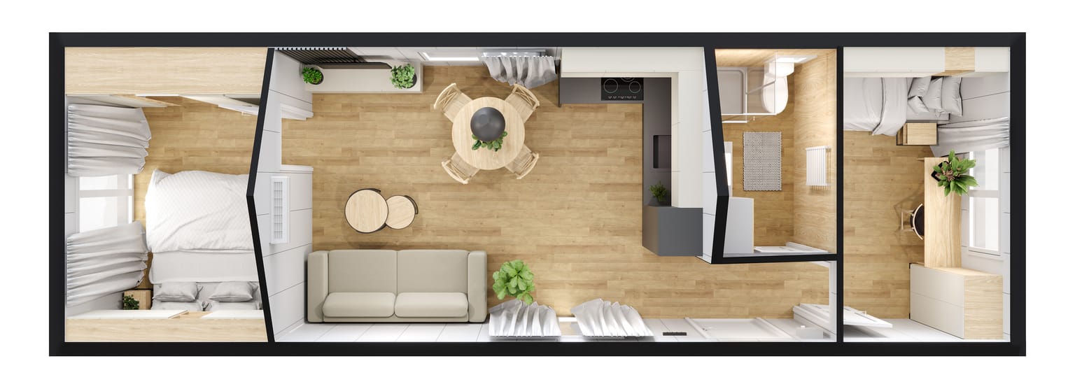 Riviera ist ein 48m² großes und ganzjährig bewohnbares Tiny House. Dank der zwei gegenüberliegenden Schlafzimmer können Sie auch im Tiny House Ihre Privatsphäre genießen.